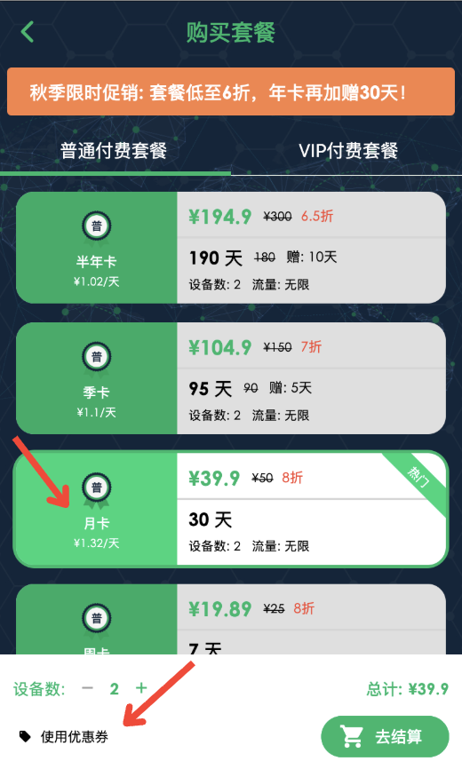 首先选择好您要兑换的套餐类型,比如:月卡。然后在页面左下角点击 “使用优惠券”,输入您的优惠码并确认即可享受折扣。